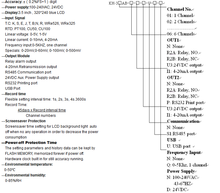E.g. Order Code: KH306AB-R2A-R2B-S1-U-Q-N, model: KH300AB, 96X96X70mm, 6 Channels input, 2 relay output, RS485 communication port, USB transfer, 0-5Hz frequency input, 100-240VAC power supply.
