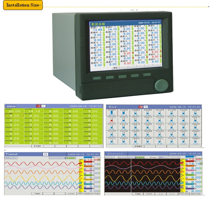 KH400 color paperless recorder (288X288X280mm, up to 40 channels) is color TFT LCD display; completely isolated universal input such as thermocouple, thermal resistance, current and voltage, adopts modular structure output functions such as alarm, auxiliary power supply for sensors output, retransmission, print and communication etc. Measuring data can be displayed in various types, such as graphic display as bar-graph, real-time trending, history trending memory, and alarming state display. also can be printed in curve and data by mini printer through RS232 port ; The recorder uses LINUX operating system with password protection. 64M memory capacity built in, can be increased if need. In addition to RS232/485 communication based on MODBUS-RTU and USB memory for download data, the recorder also can be connected with ENTHERNET at 10M rate to support the PC to configuration in long-distance and managing data; and can also monitor and control in long distance by MODEM telephone or wireless data transmitting ways.