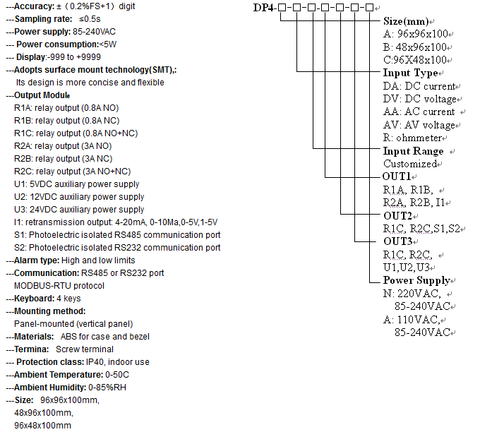 DP4 series meter adopts is intelligent ammeter/voltmeter/ohmmeter adopting high- precision IC chip design with high stability and strong anti-jamming; adopts modular structure output functions such as high or low limit alarm, current 4-20mA and 0-10mA output and RS485/RS232 communication etc. high or low limit alarm, corresponding measured value and transmission output value can be set optionally. The modern advanced MODBUS communication protocol is available, with maximum bound rate 19200 bit/s.