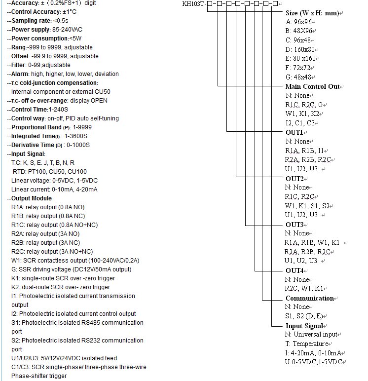 KH103T is a economic intelligent PID process controller, intelligent PID self-tuning, on-0ff and automatic PID control shifted flexibly, high-accuracy measurement and data acquisition compatible; universal input such as thermocouple, thermal resistance, current and voltage, can measure accurately and control temperature, pressure, liquid level, gravity, instantaneous flow and others; adopts SMT technology, modular structure output functions such as relay, SSR, SCR, auxiliary power supply for sensors output, retransmission, print and communication etc, easy and flexible to configuration.
