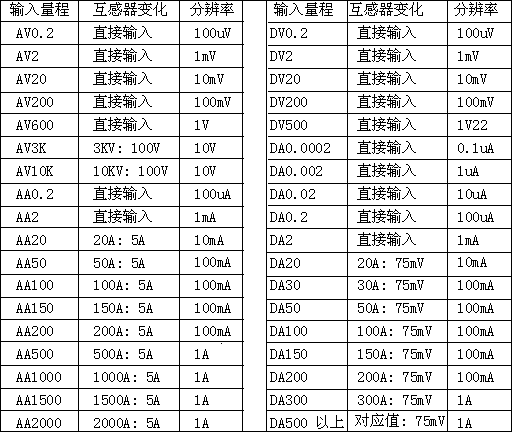 電流、電壓表輸入規格:(單位:電壓V;電流A)
